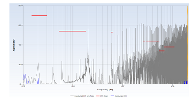 上面是開關電源輸入端的傳導EMI的仿真。紅線是CISPR25限制,如果要通過汽車用途認證,則需要遵守這些限制。該設計并非旨在用于汽車用途,但這是一個易于使用的示例?;疑靵y是沒有濾波器的傳導EMI。它顯然嚴重超出了限制。您可能只需要在左下角和右下角劃出的藍色走線就是帶有基本PI濾波器的傳導EMI。