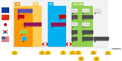 行業(yè)分析公司Navian的一份報告總結(jié)了這種共存問題:“ Wi-Fi5 GHz頻段對智能手機至關(guān)重要,它位于4.5 GHz67 GHz頻段之間。如果要充分利用這些頻率,則每個帶寬都需要一個陡峭的濾波器。同樣,對于n77n79 5G頻段,由于200 MHz的頻段間隙太窄而無法充分利用,因此同時需要用于這些頻段的高性能濾波器。