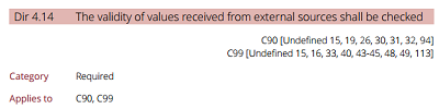 最著名的編程標(biāo)準(zhǔn)可能是MISRA標(biāo)準(zhǔn),該標(biāo)準(zhǔn)于1998年首次發(fā)布給汽車行業(yè)。這些標(biāo)準(zhǔn)的普及反映在提供某種級(jí)別的MISRA檢查的嵌入式編譯器中。MISRA的最新版本是MISRA C2012,其頁數(shù)幾乎是其前身的兩倍。這些附加文檔中的大多數(shù)包含有關(guān)每個(gè)規(guī)則為何存在的有用解釋,以及該規(guī)則的各種例外的詳細(xì)信息。MISRA有幾個(gè)準(zhǔn)則,并且在適用時(shí),它們包含對(duì)標(biāo)準(zhǔn)或未定義,未指定和實(shí)現(xiàn)定義的行為的引用。這樣的一個(gè)例子可以在圖3中看到。